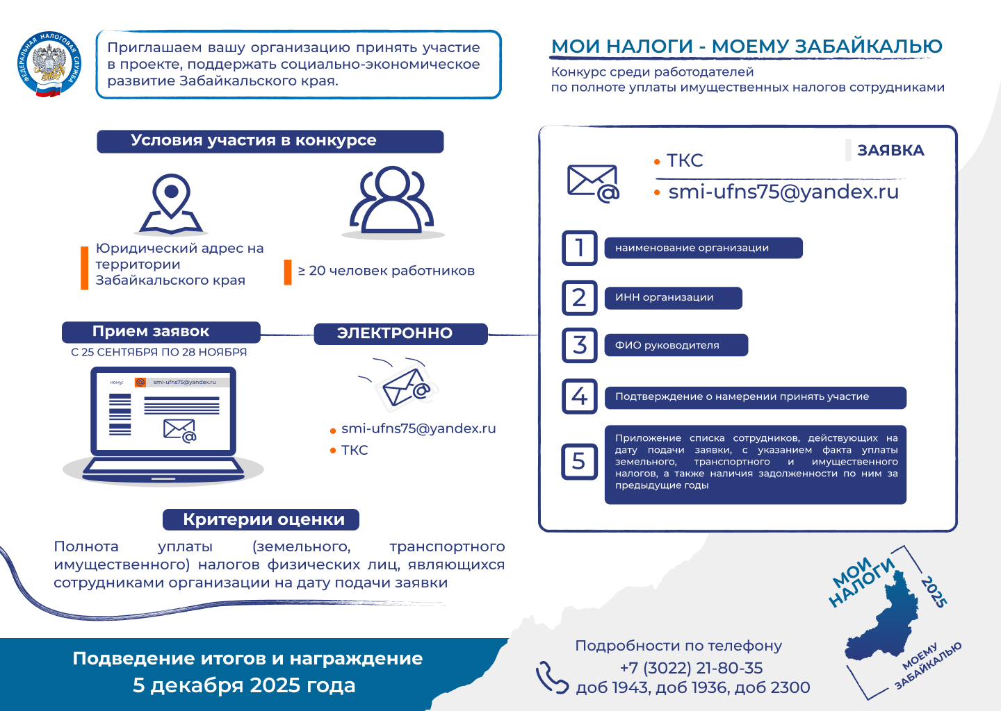 Управление Федеральной налоговой службы по Забайкальскому краю объявляет конкурс среди организаций «Мои налоги – моему Забайкалью». С 1 октября в Забайкальском крае стартовал конкурс «Мои налоги – моему Забайкалью». К участию приглашаются организации, имеющие адрес места нахождения на территории региона, с численностью работников не менее 20 человек. Заявки принимаются с 1 октября по 28 ноября 2025 года (включительно) только в электронной форме по ТКС через операторов связи или на адрес электронной почты: smi-ufns75@yandex.ru. Заявка должна содержать: - наименование организации; - ИНН организации; - ФИО руководителя; - подтверждение о намерении принять участие («Участвуем в конкурсе «Мои налоги – моему Забайкалью»); - приложение списка действующих на дату подачи заявки сотрудников с указанием факта уплаты имущественных налогов (земельного, транспортного налогов и налога на имущество, включая задолженность по данным налогам предыдущих лет). С 1 октября по 28 ноября все работники организации-участника должны исполнить обязанность по уплате имущественных налогов и задолженности за предшествующие годы. Проверка перечня сотрудников будет производиться путем сравнения списка, поданного в заявке, с данными налоговой отчетности. Подведение итогов состоится 5 декабря. Награждение победителей конкурса пройдет в период с 8 по 15 декабря 2025 года.